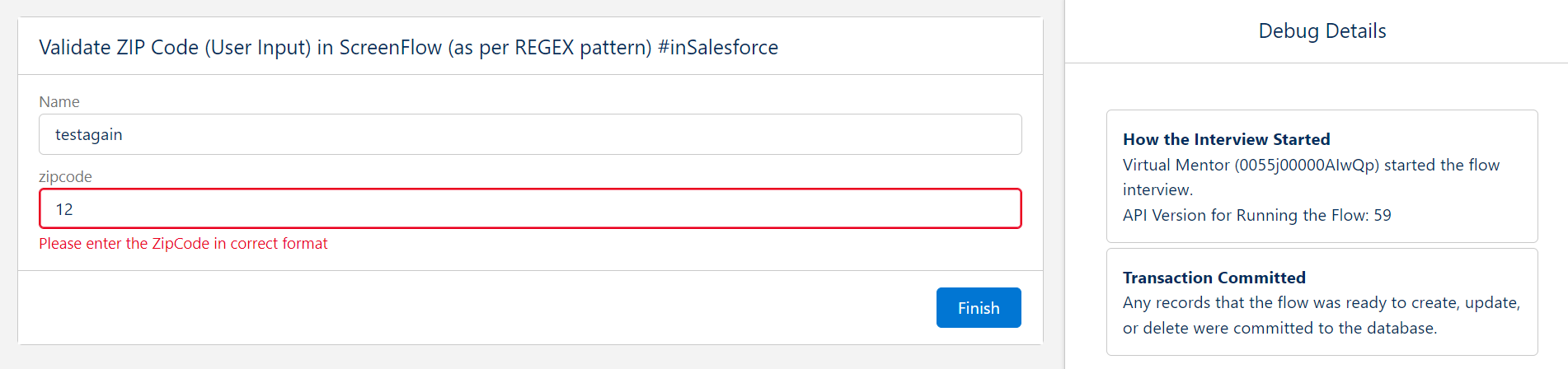 Validate ZIP Code (User Input) in ScreenFlow (as per REGEX pattern) #inSalesforce on January 28, 2024 Get link Facebook X Pinterest Email Other Apps Validate ZIP Code (User Input) in ScreenFlow (as per REGEX pattern) #inSalesforceRegex Formula: REGEX({!Zipcode},"\\d{5}(-\\d{4})?")Visual: https://www.youtube.com/watch?v=KZ4WTuJhrmw Comments